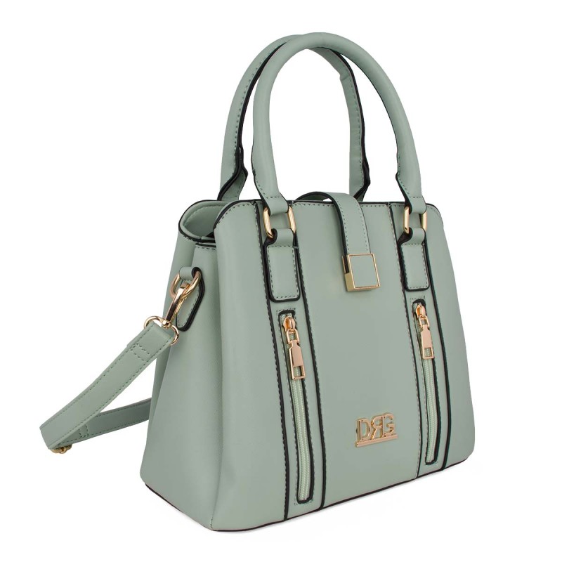 Women's sage shoulder bag. Eco-leather. It has 2 internal compartments, one with a zipper, and 3 external zippered pockets on the front and back. It closes with a metallic clasp and zipper. Adjustable, detachable crossbody strap. Dimensions: H 26cm, W 24cm, D 15cm "Designed in Greece exclusively by De Raggi designers".