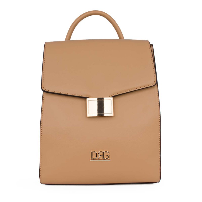 Women's backpack beige. Eco-leather. It features 2 internal compartments with a divider in the middle, 2 internal slots with one zippered, and 1 external zippered pocket at the back. Besides the flap, it also closes with a zipper. Dimensions: H 32cm, W 26cm, D 14cm. "Designed in Greece exclusively by De Raggi designers".